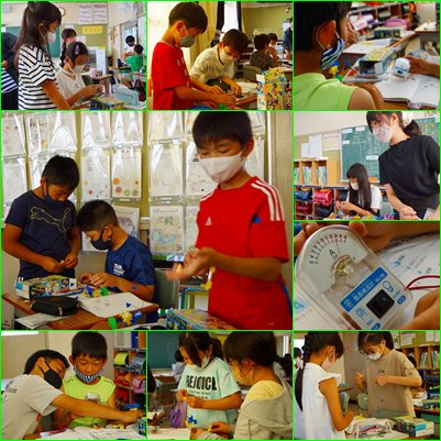 電池とスイッチと小さなファンと簡易電流計をつなぎ、流れる電気の量を調べていました。実験は、一人ずつでできるのですが、困っている子がいると、皆でああでもないこうでもないと寄って集って助け合う様子がエネルギッシュでした。