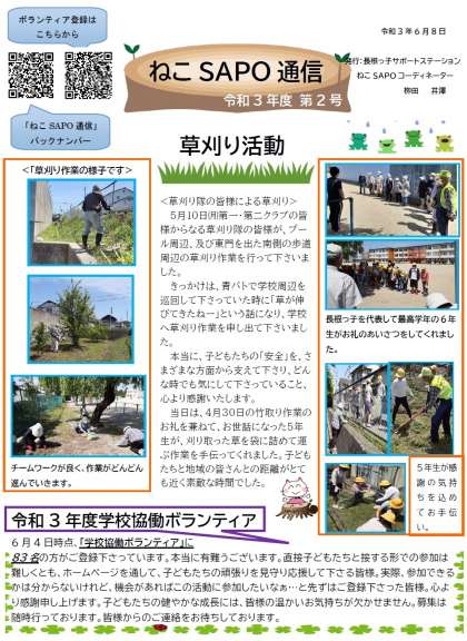 第1・第2クラブさんの草刈りを特集したねこSAPO通信が発行されましたのでご紹介します。8日に、お子様を通じて配付いたします。