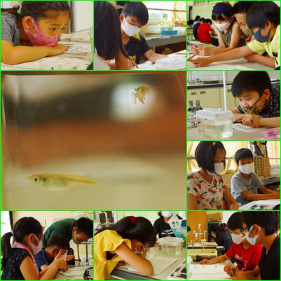メダカの雌雄を見分けていました。ビデオや画像でももちろん確かめてはいるのですが、本物を観察するのも大切なことです。おしりに卵をつけているメスもいて、最初に発見した子が尊敬を集めていました。
