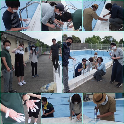 先生たちがプールに集合しています。今年度は、水泳の授業を行いませんので、今のうちにプールの表示等の修繕をしました。隙間ができているところをコーキングで固めました。安全に水泳の授業ができるように今できることをやっています。