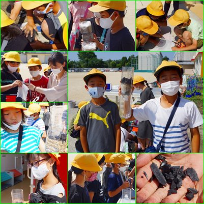 総合の時間を使って、社会で勉強している「水はどこから」で使う簡易ろ過器をペットボトルと砂と小石と炭を使って作っていました。美しい、透明な水ができるでしょうか。