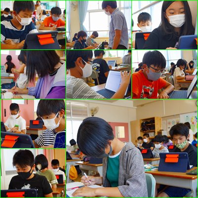 タブレットに入っているデジタル教科書を使って、各自が黙々と学習を進めていました。デジタル教科書は、今年は5・6年の算数だけが入れられています。紙媒体だけの場合と併用の場合と、デジタル教科書だけの場合と、それぞれどんな学習効果が表れるか、確かめるための措置です。