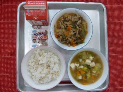今日の給食は、麦ごはん・つみれ汁・野菜豚丼・牛乳・かみかみ大豆でした。