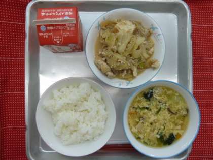 今日の給食は、かきたま汁・厚あげとキャベツのじゃこ炒め・ごはん・牛乳でした。