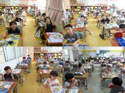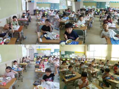 写真は、1年生の給食の様子です。「今日も残さずにたくさん食べるね」と声をかけてくれる子がたくさんいました。