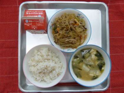 今日の給食は、麦ごはん・キムチスープ・チャプチェ・牛乳でした。