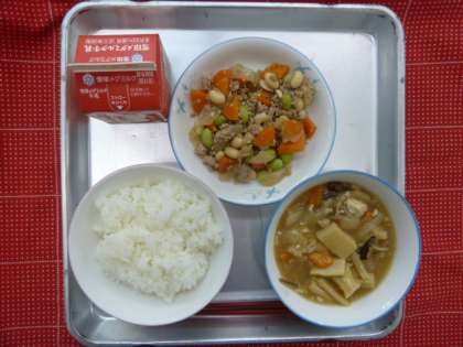 今日の給食は、とうがんのうま煮・ピリ辛大豆・ごはん・牛乳でした。