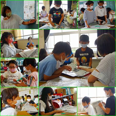 今年も地域の新聞販売店さんのご協力で新聞づくりの教室が行われます。今日は、各クラスにたくさんいただいた新聞の記事を切り抜いて、自分の新聞を作っていました。