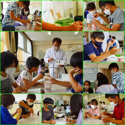 葉にもデンプンがあることを実験によって確かめていました。まず、葉の緑色を抜くために、アルコールの中に葉をつけます。色が抜け出して、アルコールがきれいな緑色になっていました。きれいな緑色を見た子どもたちは、少し嬉しそうでした。