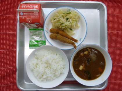 今日の給食は、たまねぎのみそ汁・めひかりのフライ・キャベツと大葉のあえもの・ごはん・牛乳・抹茶きなこ牛乳のもとでした。