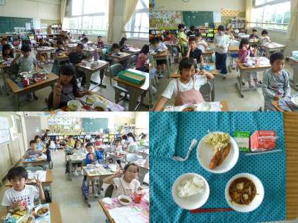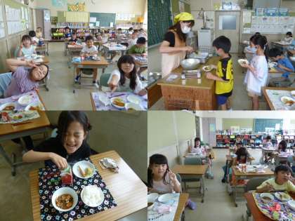 今日は「愛知を食べる学校給食の日」で、ごはん、めひかり、大葉、たまねぎ、キャベツ、抹茶などが愛知県や瀬戸市でとれた食材です。地元の恵みに感謝して、いただきました。