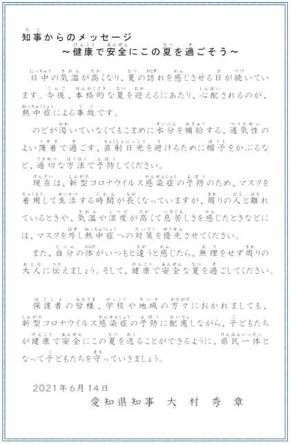 愛知県知事からのメッセージ 公開日 2021/06/21 更新日 2021/06/21 学校・学年ニュース 熱中症の危険性が増す季節となりました。愛知県知事から、熱中症とコロナ感染予防に関してメッセージが届きましたのでご紹介します。
