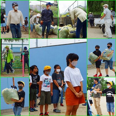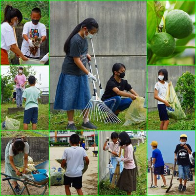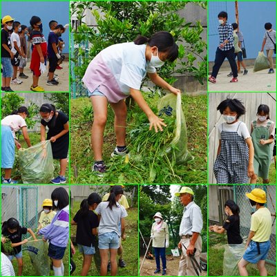 2限目には、6年生が次々やってきてお手伝いをしました。子どもたちが入れ代わり立ち代わり、元気にやってくるので、ずっと草刈りをしてそろそろ疲れてきていた大人たちもゆっくりできません。天気はちょうどよい曇りでしたが、風がなかったので、皆汗びっしょりになりました。