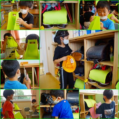かわいらしい黄緑色のボックスを手に、早速1年2組と3組がロッカーの整頓をしていました。
