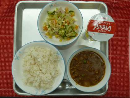 今日の給食は、麦ごはん・カレー・イタリアンサラダ・発酵乳でした。