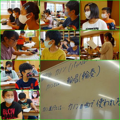 カノン(輪奏)のコード進行の特色を現代のポップス曲のメロディーと重ねた説明を聞いた後、実際に自分たちで演奏をするのに備えてパート決めをしていました。緊急事態宣言が明け、素敵な演奏が聴こえてくるのが楽しみです。