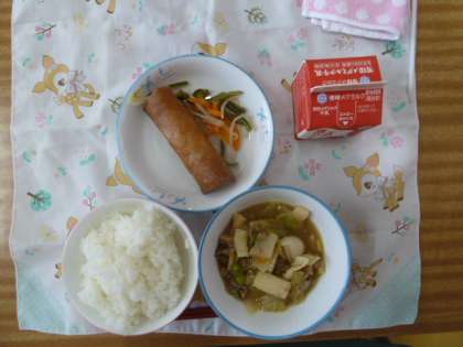 今日の給食は、うずら卵といかの中華煮・春巻き・くきわかめのあえもの・ごはん・牛乳でした。