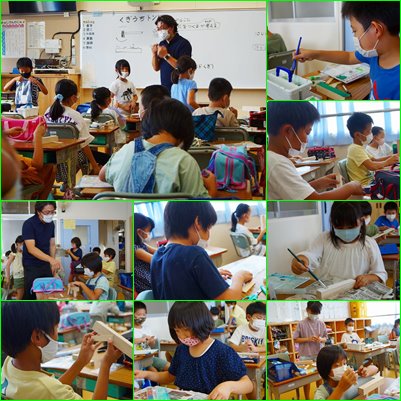 「クギうちトントン」という教材です。木とクギを使って工作をします。今日は材料を眺めながら、どんなものを作るかイメージし、木に色を付ける作業に入っていました。