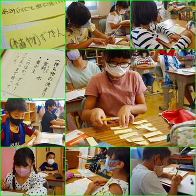 山小屋にもっていくとよさそうなものを付箋に書き出していました。たくさん書けましたが、持っていけるものはグループで5つまでだそうです。この後、グループで話し合いながら5つに絞る作業で盛り上がりそうです。