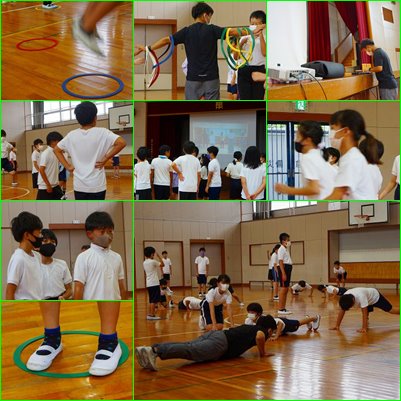 こちらは体を起こすウォームアップが行われていました。体育館にいろいろな色の輪をいくつかおいて、歩き回りながら(走ってはいけないルールのようでした)、合図があるとどこかの輪の中に立つというゲームです。椅子取りゲームと同じ要領です。
