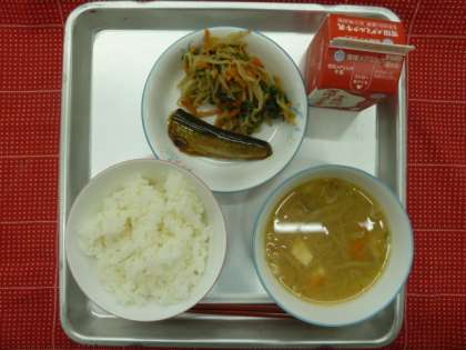 今日の給食は、五目白みそ汁・いわしの梅煮・ほうれん草のごまあえ・ごはん・牛乳でした。