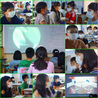 ビーカーの水が減っていく理由を考え、見えない水蒸気となって空気中に出ていくことに気づいたあと、映像(NHK for school)で学びの確認をしていました。子どもたちは、「おお〜、よく動くね〜」などと、声を上げながら映像に見入っていました。
