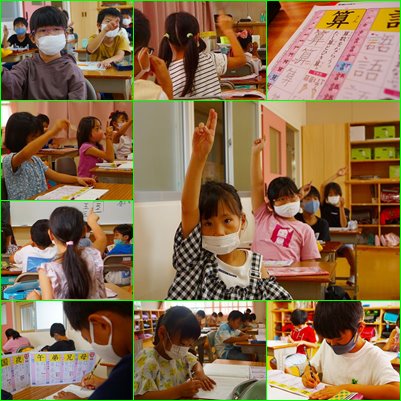 新出漢字の確認をしていました。「夜」「国」「語」「算」は、8画から14画の漢字です。画数が多く、正しい書き順を覚えるのもなかなか大変です。子どもたちは元気に手を動かして空書きをしながらしっかり覚えようと頑張っていました。