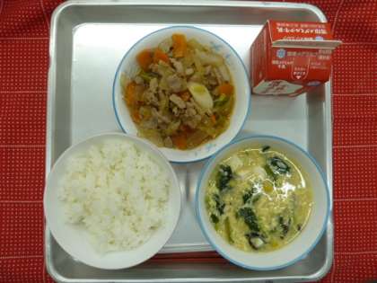 今日の給食は、卵とコーンのスープ・野菜豚丼・ごはん・牛乳でした。