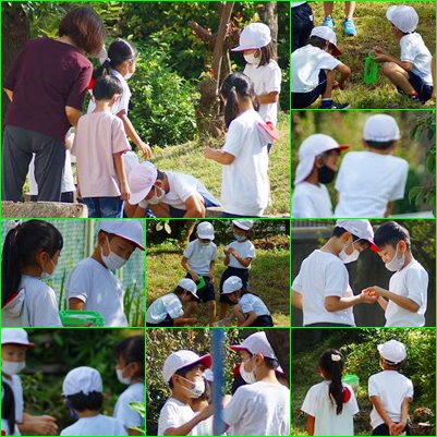 ふれあい広場でバッタ探しをしていました。最近、バッタを捕まえるのが流行っているようで、朝の始業前にふれあい広場には虫かごをもった子どもたちがたくさんやってきます。