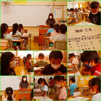 緊急事態宣言が解除されたので、文科省からの通達に従い、マスクをして小さな声で歌い始めていました。「虫のこえ」で「チンチロチンチロ」、「リンリンリンリン」などとひそやかな虫のこえを表現するところは、さらに声がやさしく、小さくなります。ダイナミックレンジの幅が小さい中でも、子どもたちはよく考えて音楽の強弱を表現していました。
