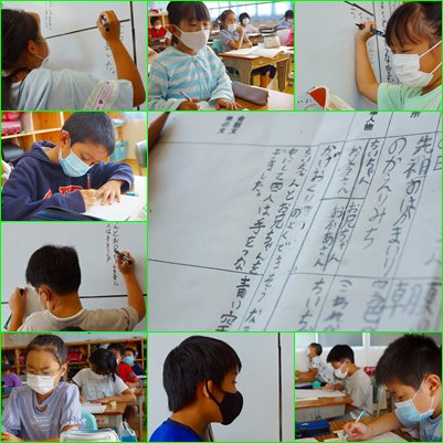 「ちいちゃんのかげおくり」の2つのかげおくりの場面を比べて表にしていました。他クラスの初発感想を書く授業でもそうでしたが、このクラスもストーリーの重たさがクラスをしっとりと落ち着いた雰囲気にしていました。