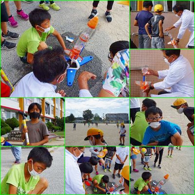 4の1が運動場でペットボトルのロケットを飛ばそうとしていました。空気の入れ方や、セットの仕方など、それなりに熟練が必要な様子です。空気が入って、発射準備が整ってくると、皆運動場の反対側に走って、ロケットの到着を待っていました。