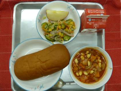 今日の給食は、黒ロールパン・ポークビーンズ・フレンチサラダ・りんご・牛乳でした。