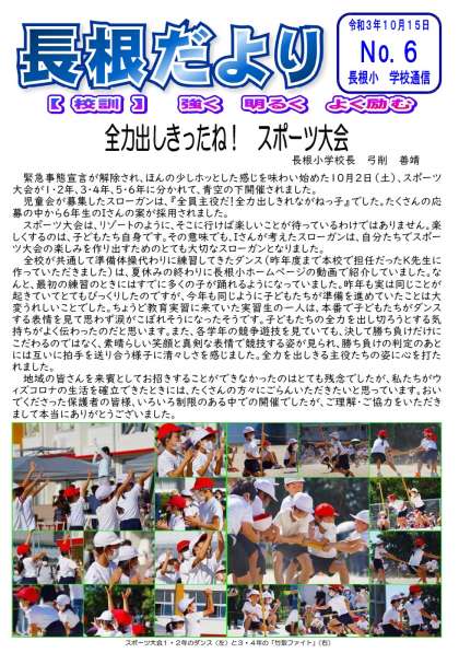 本日発行の「長根だよりNo.6」をお子様を通じて配付いたします。下のリンクからもご覧いただけます。青色の文字をクリックしてご覧ください。