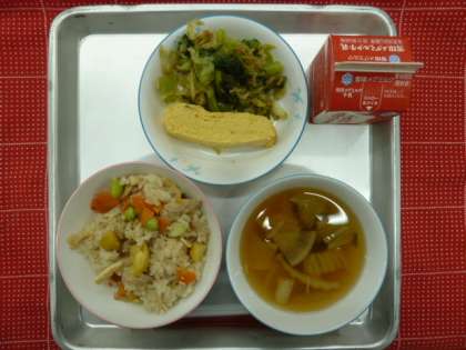 今日の給食は、栗ごはん・すまし汁・五目厚焼きたまご・キャベツのおかかあえ・牛乳でした。