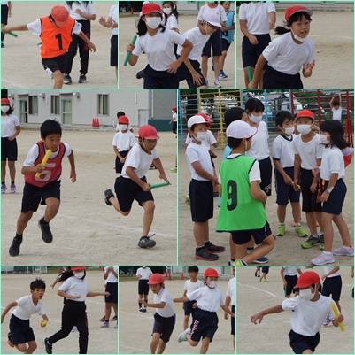 リレーで競い合いました。テイクオーバーゾーンを上手に使って、バトンパスをする練習をしました。失速しないように受け渡しができている班もありました。息をきらしながら、次の対戦に向けて話し合いにも熱が入ります。
