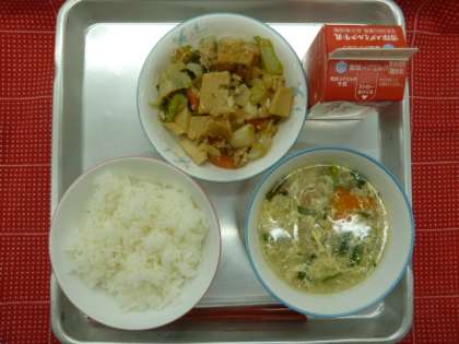 今日の給食は、にらたまスープ・チンゲンサイと生揚げの中華炒め・牛乳でした。