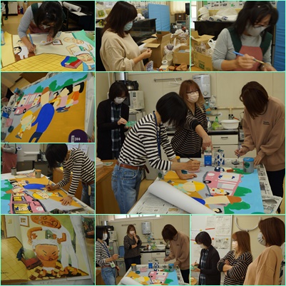 大型絵本制作の再開です。昨日、久しぶりに来ていただきました。次の作品に向けて、絵具や道具の補充をしました。大まかな色塗りに続き、細かいところの線入れとみるみるうちに、仕上がっていきます。新作が楽しみです。