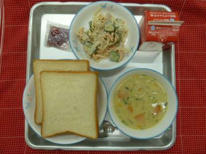 今日の給食は、スライスパン・豆乳コーンスープ・切干大根サラダ・牛乳・いちごジャムでした。
