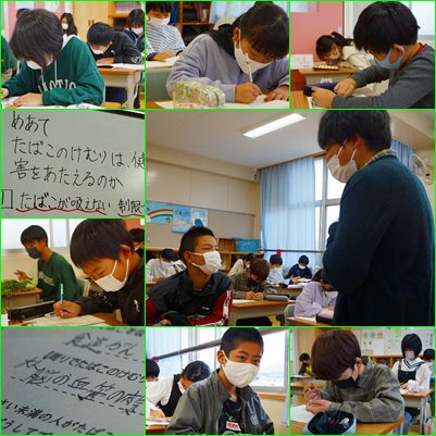 たばこの害について考えていました。予備知識のある子とそうでない子がいましたが、教科書の重要部分を見つけ出して、どんどんプリントに書き込んでいました。