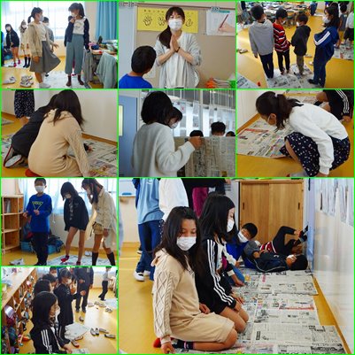 1m×1mの正方形の新聞紙を作り、その大きさを実感していました。次にその新聞紙を使って教室の大きさを調べていました。1平方メートルの大きさにも教室の広さにも驚いていました。