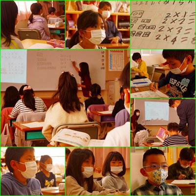 2の段のかけ算をまず確認します。2人乗りのゴーカートが1台ずつ増えていくと、乗っている人が2人ずつ増えていることに気づけました。
