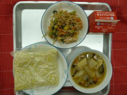 今日の給食は、ラーメン・中華あんかけ・ごぼうと小松菜のサラダ・牛乳でした。