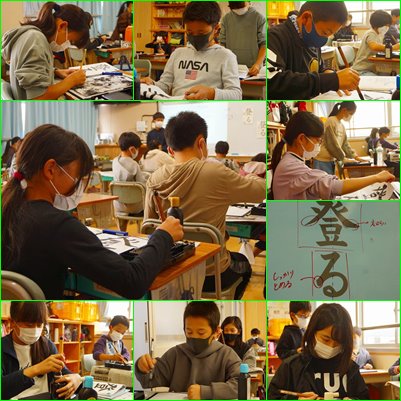 「登る」の練習中でした。平仮名の「る」は漢字にはない筆の動きが求められます。「の」や「る」、「ね」などのようなまるい部分の筆の運びです。