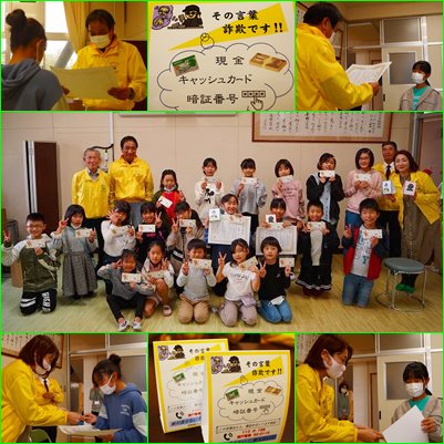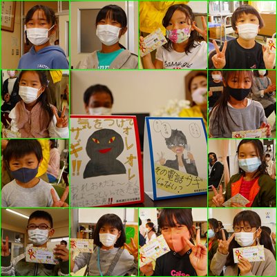 長根連区自治協議会様が地域のお一人で生活されているお年寄りを特殊詐欺から守ろうと卓上ポップを作られることになりました。1面には、自治会からのメッセージを、そしてもう1面には子どもたちからのメッセージをのせることとなり、22人の子どもたちが募集に応え、自作のカットを応募しました。