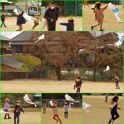 よくできているたこのようで、どの子も風に乗せて上手に上げることができていました。糸を伸ばしてずいぶん高くまで上げている子もいました。真っ赤になって走り回る子どもたちの表情が印象に残りました。
