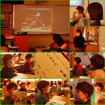 たぬきの糸車の学習に入りました。我々の年代であれば、「たぬきが障子の破れ目から糸車を回す様子をのぞくタヌキ」と言われれば、その様子が思い浮かびますが、子どもたちはそう簡単にはいきません。障子の画像を検索して確かめたり、それが破れている様子を探したり、また土間の画像や糸車を操る様子の動画を見たりと、いろいろな予備知識をまず知識に入れておく必要があります。今日は、1ページずつ、知らない言葉をあげて皆でしっかり調べていました。