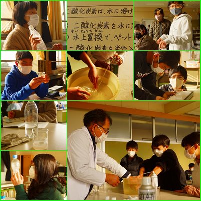 二酸化炭素は水に溶けるのかを実験していました。二酸化炭素スプレーを使って、ペットボトルに水と二酸化炭素を入れ、よく振ります。その後、ペットボトルの液を石灰水に入れます。