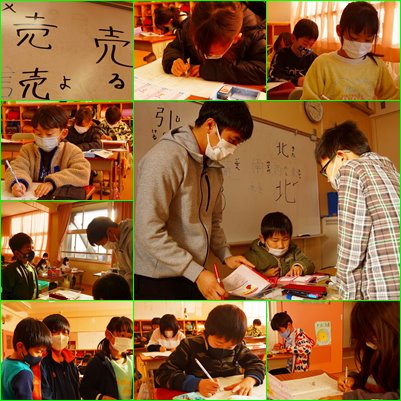横棒の長さによく注意しながら、正しく漢字を書きます。書けたら担任が一人一人チェックしていきます。