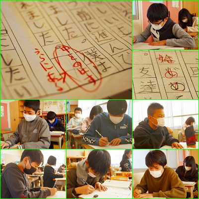 大切にしたい言葉についての作文を書いています。友達の意見も参考にして、赤で書き込みを入れながら、完成に近づけていきます。